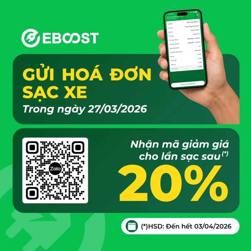 Sạc tại trạm EBOOST vào Thứ Sáu 27/03/2026 và nhận ngay mã giảm 20% cho lần sạc tiếp theo (Vui lòng nhập mã trước khi kích hoạt sạc)
